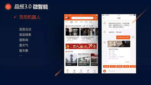 “除了大家熟悉的內(nèi)容算法智能推薦,我們還為晶報APP3.0增加了語音聯(lián)播、互動機(jī)器人等功能,讓用戶不用動手指,僅通過語音就能搜索內(nèi)容,與晶報互動?!?/p>